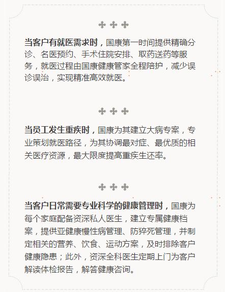 大健康时代的背景下,学会正确规避风险,财富投资与健康投资双管齐下,实现资产增值的同时获得长久的健康与生命的延续,无疑是稳赚不赔的格局。国康致力于为客户家庭健康保驾护航,为解决客户就医专业痛点,提升客户生活品质和幸福感而努力前进,坚持提供专业高效的高品质医疗健康服务,助力中国企业与客户个人事业腾飞。